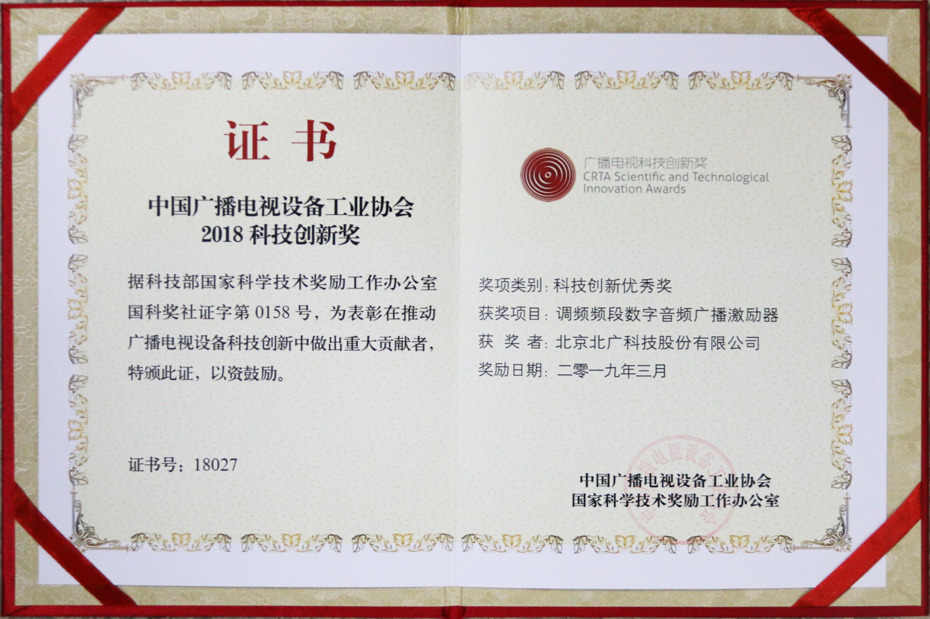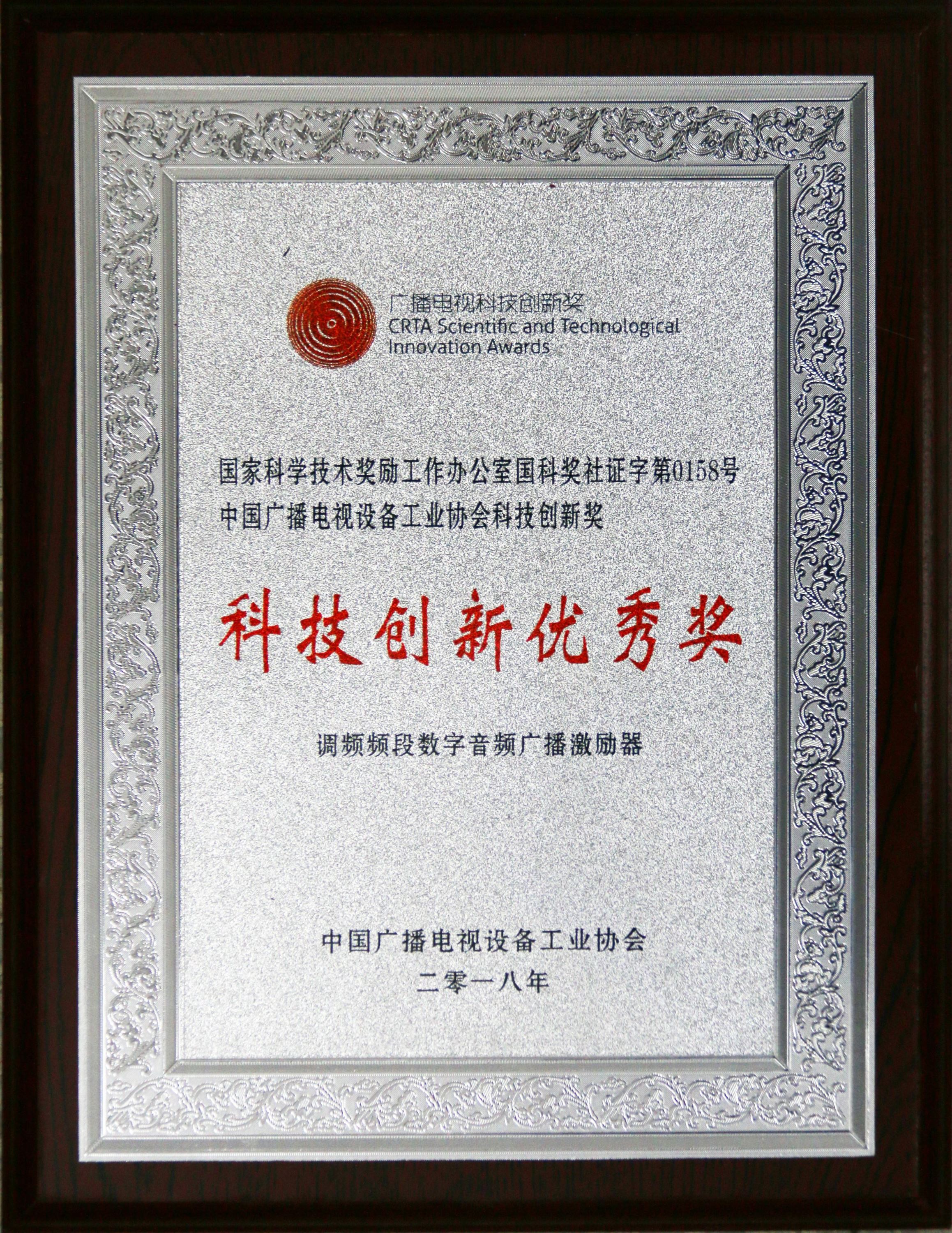 2019年3月23日,2018年度廣播電視科技創新獎頒獎儀式在望京百川匯隆重舉行,在頒獎現場,大會公布了2018年度廣播電視行業取得的眾多科技創新成果,我公司廣電事業部“調頻頻段數字音頻廣播激勵器”榮獲“2018年度中國廣播電視設備工業協會科技創新優秀獎”并入選《2018年廣播電視科技創新獎年鑒》。