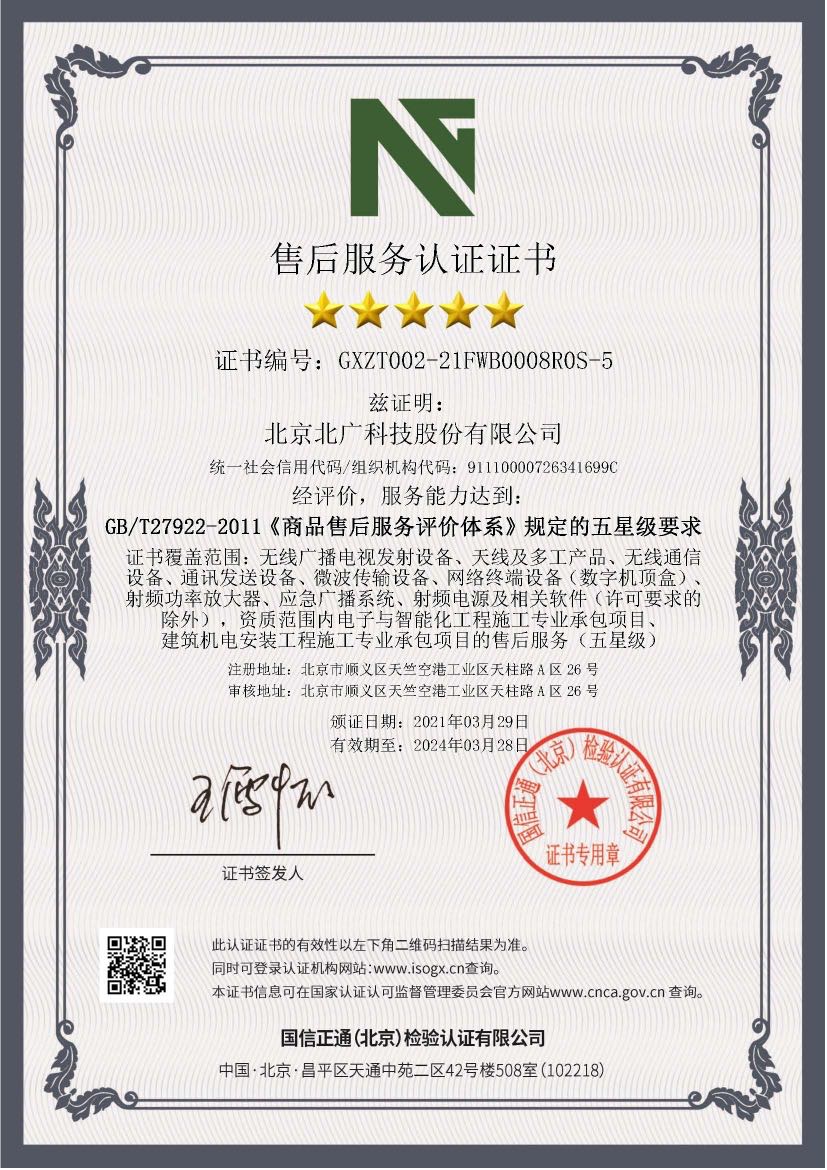 北廣科技一貫秉持“客戶無小事”的服務理念,不斷進取,不斷創新,力求為顧客創造更好的服務。近日,經國家認證認可監督管理委員會認可的權威認證機構嚴格評審,北廣科技順利通過售后服務體系審核,榮獲五星級售后服務認證證書。