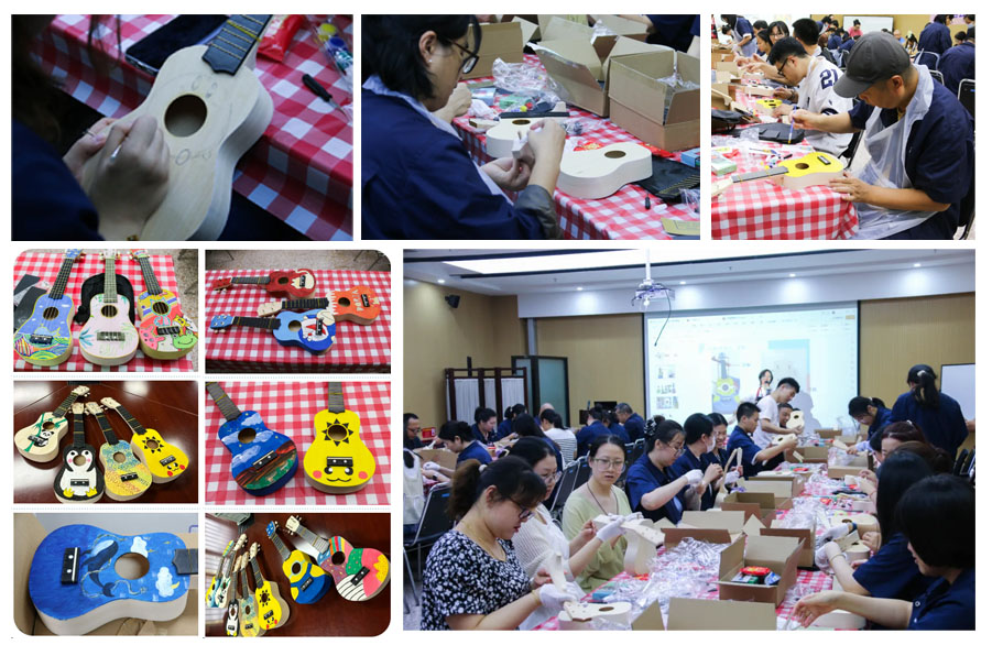 活動現(xiàn)場,在老師的引領(lǐng)下,一場尤克里里創(chuàng)意制作盛宴緩緩拉開序幕。首先,老師為大家詳細講解了尤克里里的歷史背景、基本構(gòu)造及制作流程,隨后,大家便迫不及待地投入到了有趣的制作過程中,從小心翼翼地安裝琴身開始,每一步都充滿了挑戰(zhàn)與樂趣。繪畫圖案環(huán)節(jié),職工們紛紛拿起畫筆,將心中的創(chuàng)意與情感傾注于琴身之上。有的人選擇了清新自然的風(fēng)景畫,用細膩的筆觸勾勒出山川湖海的壯麗;有的人則偏愛抽象藝術(shù),用大膽的色彩與線條表達內(nèi)心的激情與自由;還有的人更是別出心裁,將動漫角色、卡通圖案等流行元素融入設(shè)計中,展現(xiàn)出獨特的個性風(fēng)采。